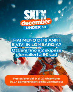 Dal 9 al 22 dicembre 2025, i giovani under 18 residenti in Lombardia possono sciare a solo 8€ al giorno. È possibile richiedere fino a 2 voucher equivalenti a 2 skipass giornalieri utilizzabili dal 9 al 22 dicembre 2025 a scelta nei 27 comprensori della Regione.